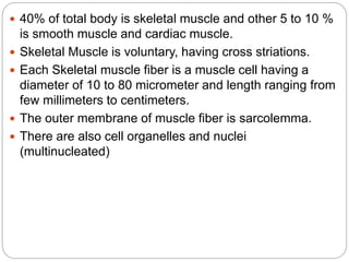 - Skeletal muscle makes up 40% of total body mass and contains long, striated muscle fibers that are multinucleated.