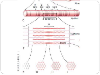 - Each muscle fiber contains numerous myofibrils composed of thin actin filaments and thick myosin filaments that overlap to form dark A bands and light I bands.