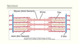 This document outlines the structural hierarchy and function of skeletal muscles. It begins with the smallest functional unit, the sarcomere, and describes the organization of actin and myosin myofilaments. It then explains the process of neuromuscular transmission where a motor unit receives an action potential from the central nervous system via the end plate. This causes excitation-contraction coupling and the release of calcium ions which trigger the cross-bridge cycling of actin and myosin to generate muscle contraction.
