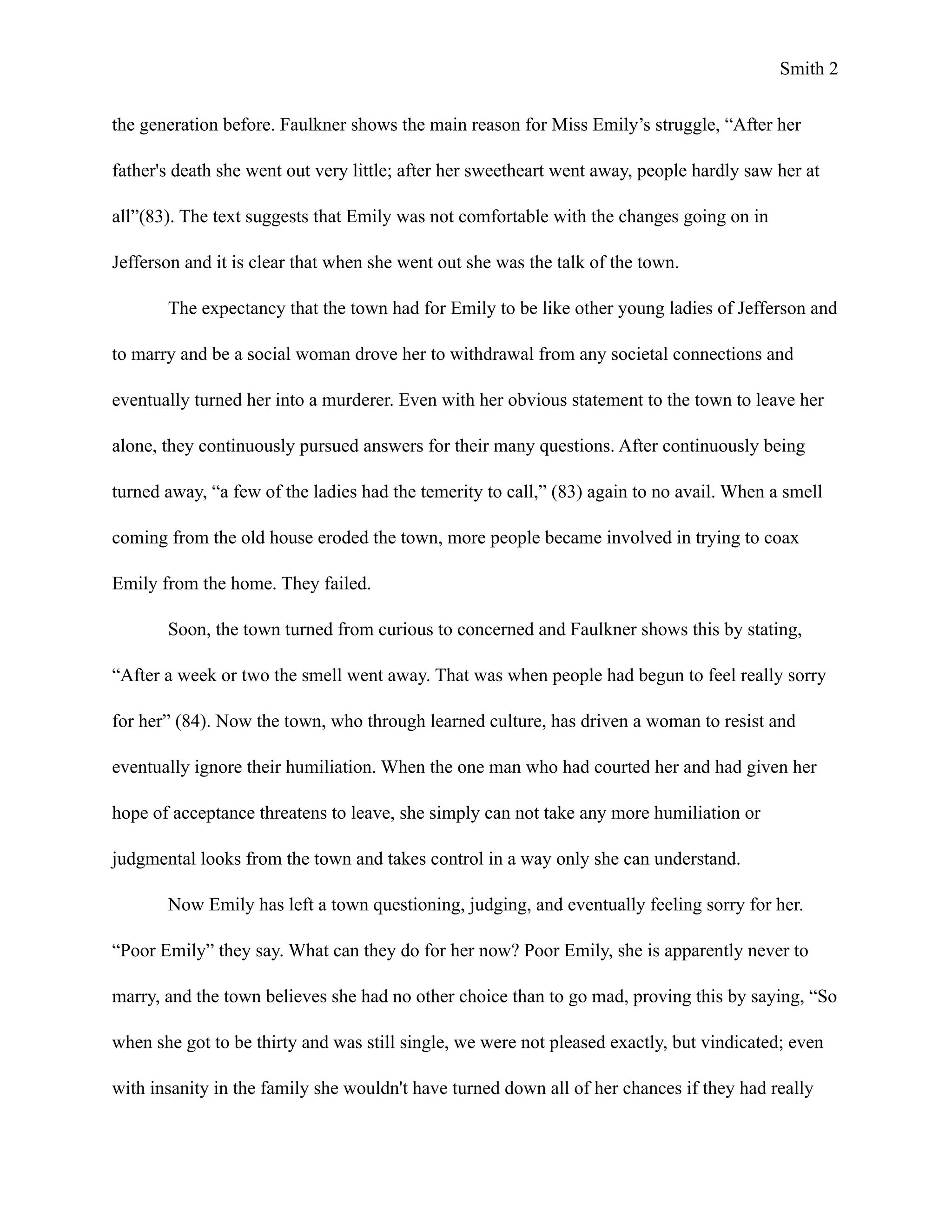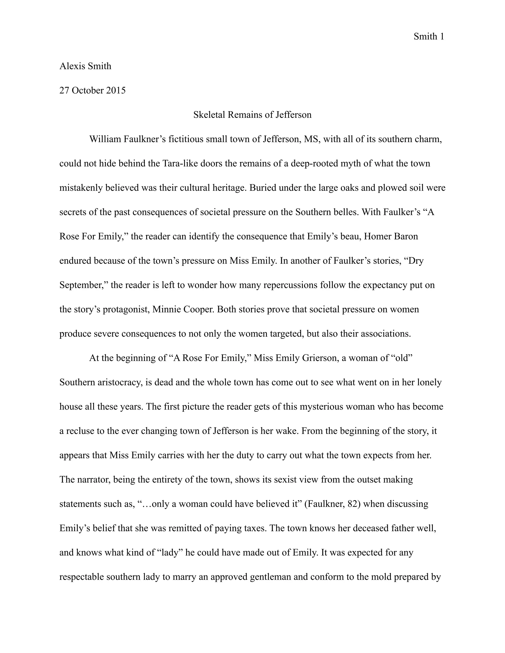 This document provides a summary and analysis of two short stories by William Faulkner set in the fictional town of Jefferson, Mississippi: "A Rose for Emily" and "Dry September." Both stories examine the societal expectations placed on unmarried women in the South and the consequences these expectations have. In "A Rose for Emily," Miss Emily Grierson is driven to isolation and eventually murder due to the town's disapproval of her single status. In "Dry September," Minnie Cooper feels obligated to lie about an encounter due to pressure, putting a man's life at risk. The document analyzes how both stories portray the oppressive nature of societal norms in the town and the harm caused to women and others as