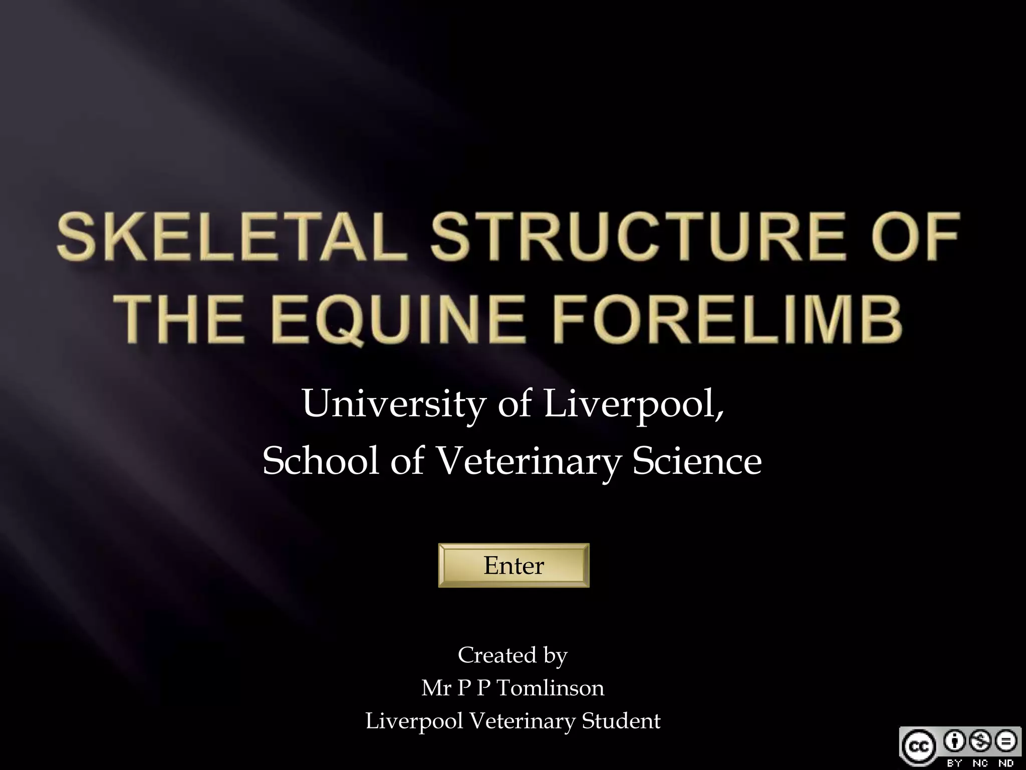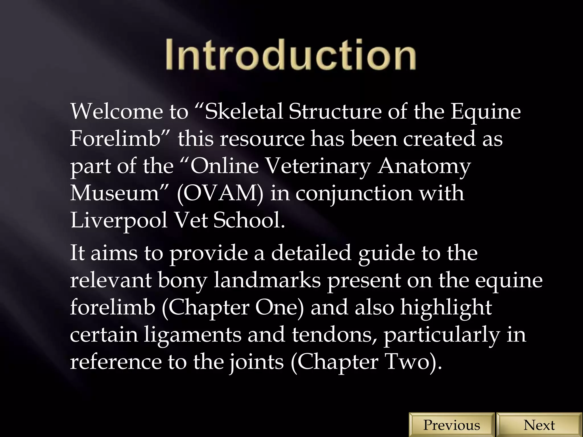 The document provides an overview of the resource titled "Skeletal Structure of the Equine Forelimb" which aims to provide detailed guides to the bony landmarks of the equine forelimb and highlight certain ligaments and tendons. It outlines the chapters and slides within the resource, providing descriptions of the bones, joints, and other structures covered on each slide. Navigation buttons are described to move between slides, access additional detail, and view information slides.