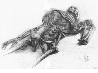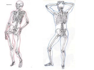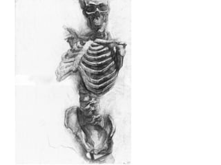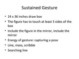 The document provides homework assignments for drawing courses, including sketching different bone structures like hands, feet, and ribcages in a sketchbook. It also assigns sustained gesture drawings within a box to capture an energetic pose, and figurative sketches using value that are then deconstructed and reconstructed into new works. Artists like Philip Pearlstein, Richard Diebenkorn, and Nathan Oliveira are listed as references.