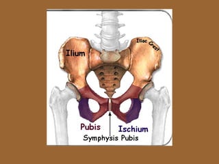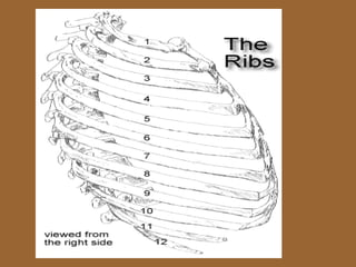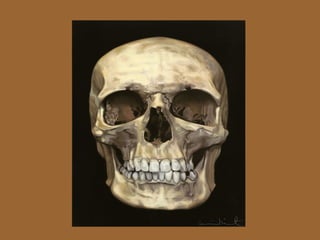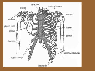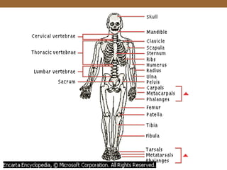 The document provides an overview of the human skeletal system, including its main components and functions. It is divided into two main sections: the axial skeleton and appendicular skeleton. The axial skeleton comprises the skull, vertebral column, sternum, and ribs. It forms the central framework and protects the brain, spinal cord, and internal organs. The appendicular skeleton includes the bones of the upper and lower limbs, as well as the pectoral and pelvic girdles that attach the limbs to the axial skeleton.