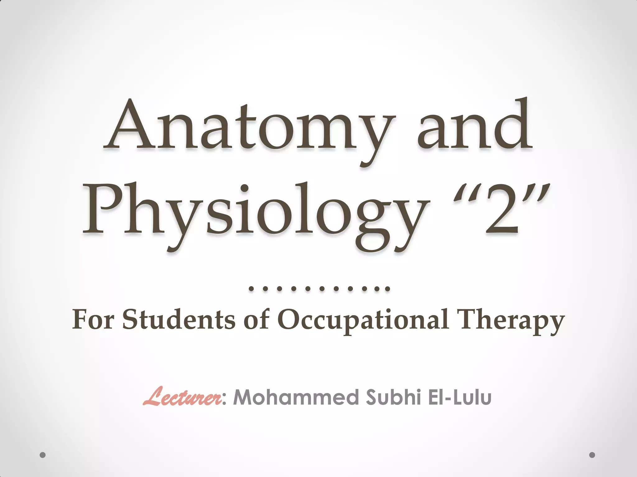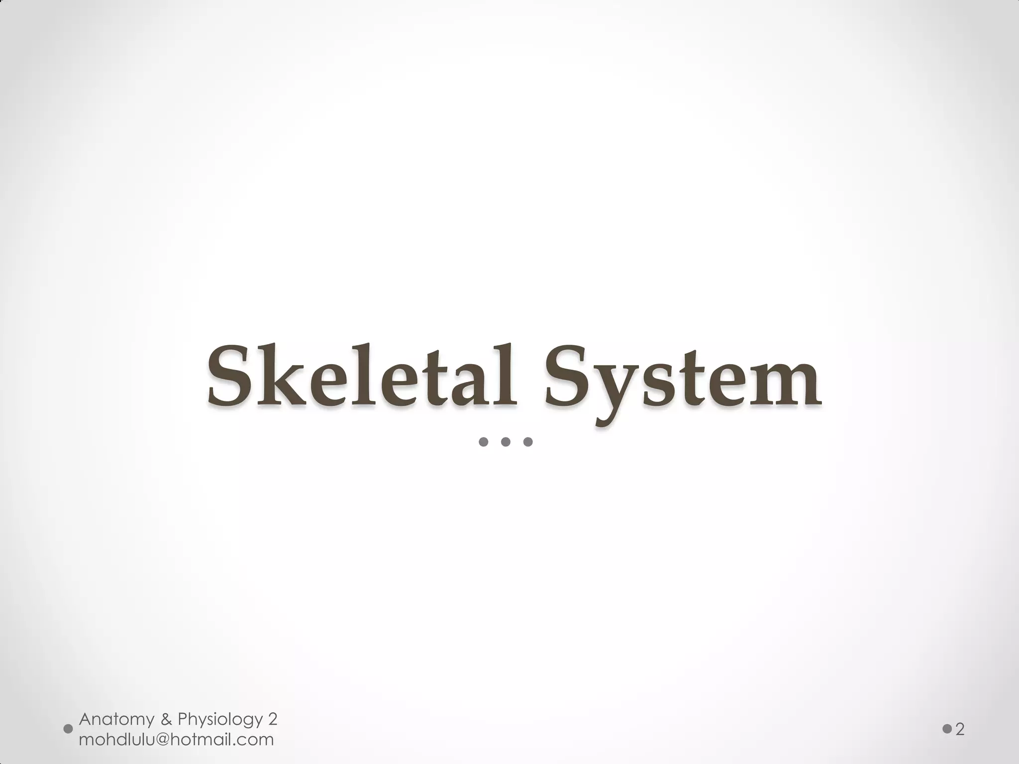 The document is a lecture on the skeletal system presented to occupational therapy students. It covers the main functions of the skeletal system which are support, protection, movement, storage of blood cells and energy. It then details the different bone shapes, structures, types of bone cells and anatomy of long bones. The document also discusses the skull bones, vertebral column, bones of the upper and lower limbs and pelvis. Finally, it examines the three types of joints - fibrous, cartilaginous and synovial - and describes the movements associated with synovial joints such as flexion, extension, and rotation.