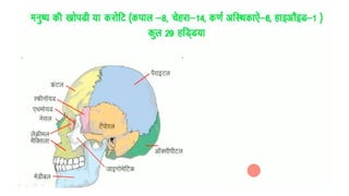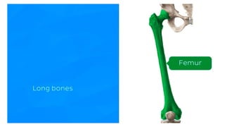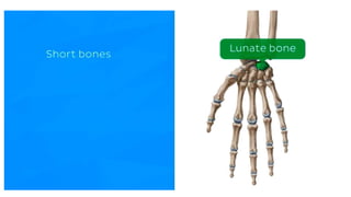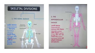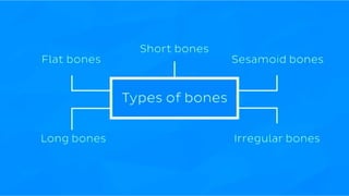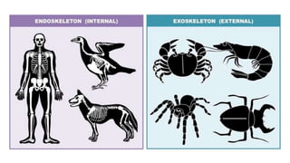 The skeletal system consists of bones and cartilage that make up the endoskeletal framework of the human body. There are two main types of skeletons: exoskeletons, which are external structures that support and protect the body, and endoskeletons, which are internal structures composed of mineralized tissue. The human skeletal system contains 206 bones that make up the axial skeleton including the skull, vertebral column, and thorax, and the appendicular skeleton including the upper and lower limbs. The skeletal system provides structure and support for the body, allows for movement, protects internal organs, produces blood cells, and stores minerals. Bones develop through two processes: intramembranous ossification which forms flat bones,