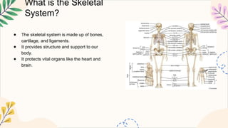 The skeletal system is the body's framework, consisting of bones, cartilage, and ligaments that provide structure, support, and protection for vital organs. An adult human has 206 bones, which serve various functions including movement, mineral storage, and housing blood cell production in bone marrow. It is important to maintain bone health through nutrition, exercise, and awareness of common injuries.