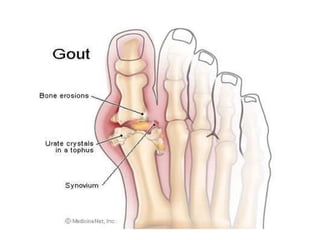 The skeletal system consists of bones, joints, and cartilage that provide structure, protection, movement, and support. There are two main divisions - the axial skeleton which includes the skull, vertebral column, and rib cage, and the appendicular skeleton which includes the limbs and girdles. Bones can be classified by their shape as long, short, flat, or irregular. The skeletal system allows movement through articulations between bones at joints like the ball and socket hip joint. Common diseases include arthritis, fractures, osteoporosis, and various cancers that affect the bones and bone marrow.