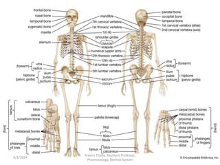 The document discusses the human skeletal system. It describes that the skeleton provides structure, protects organs, and facilitates movement. It is made up of bones, cartilage, and ligaments. The skeleton includes the axial skeleton which protects organs, and the appendicular skeleton which facilitates limb movement. Bones are categorized by shape into long, short, flat, irregular, and sesamoid types. Joints also vary in range of motion. The document outlines the components and functions of the skull, vertebrae, ribs, and other bones that make up the human skeletal system.