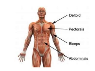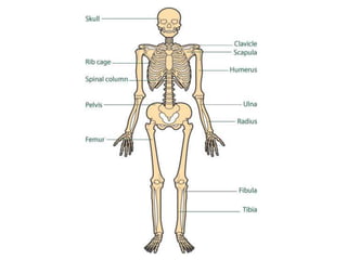 The musculoskeletal system includes bones, muscles, ligaments, and tendons. It performs three main functions: supporting the body, protecting internal organs, and allowing movement. The human skeleton contains 206 bones that come in different shapes and sizes, including long bones, short bones, flat bones, and cylindrical bones. Bones are connected by joints that can be fixed, semi-movable, or movable. Muscles are attached to bones via tendons and contract to enable movement when stimulated. Together, the bones and muscles make up the internal framework that allows the human body to function.