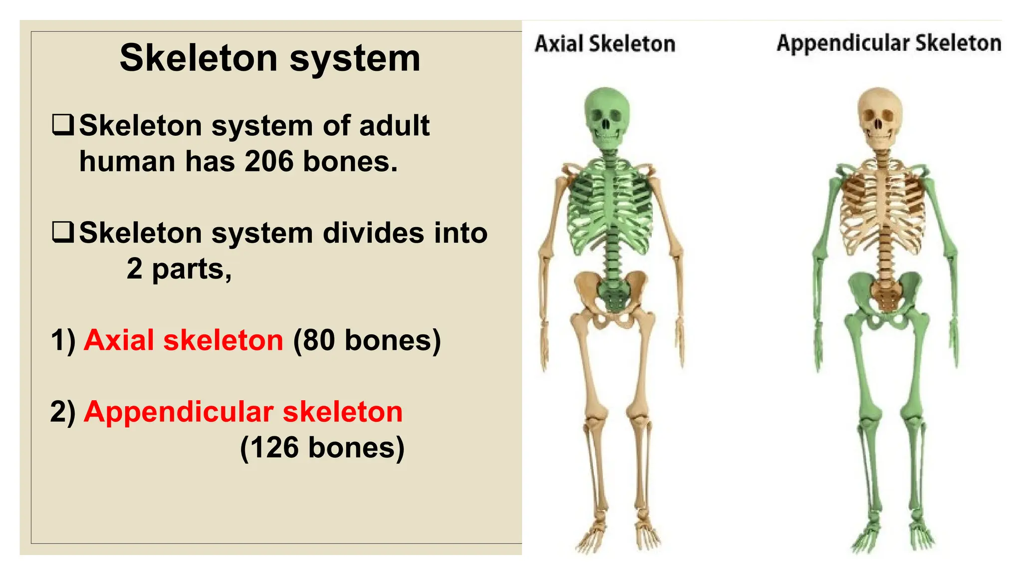 The human skeleton consists of 206 bones divided into two main parts: the axial skeleton (80 bones) and the appendicular skeleton (126 bones). The axial skeleton includes the skull, vertebral column, ribs, and sternum, while the appendicular skeleton comprises the girdles and limbs. Detailed classifications of bones by regions and types are also provided.