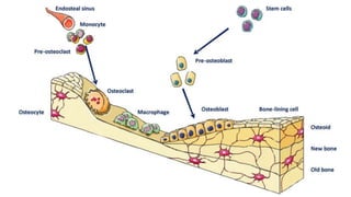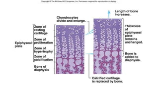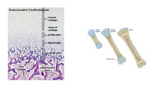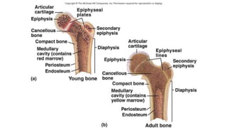 The skeletal system includes bones and cartilage that provide structure, allow for movement, and protect organs. The medical specialty of orthopedics focuses on treating the skeleton and joints. Skeletal tissue includes cartilage and bone, which are types of dense connective tissue. Bones have important functions like support, protection, movement, mineral storage, and blood cell production. Bone is made up of osteogenic cells, osteoblasts that form bone, osteocytes embedded in bone matrix, and osteoclasts that resorb bone. There are different types of bones like long bones with a diaphysis, epiphyses, and metaphysis. Bone formation occurs through intramembranous ossification or endochondral ossification. Common bone