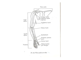 Augšējo locekļu skeletsIzšķir– plecu joslu un rokas (jeb augšējos brīvos locekļus);Rokai izšķir – augšdelmu, apakšdelmu un plauksu;Plaukstai ir trīs daļas – plaukstas pamats, delna un pirksti