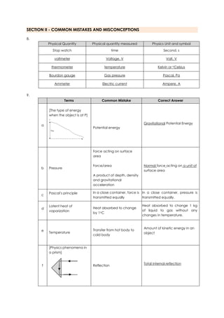 1. Common mistakes and misconceptions made by students on physical quantities, terms, and concepts.