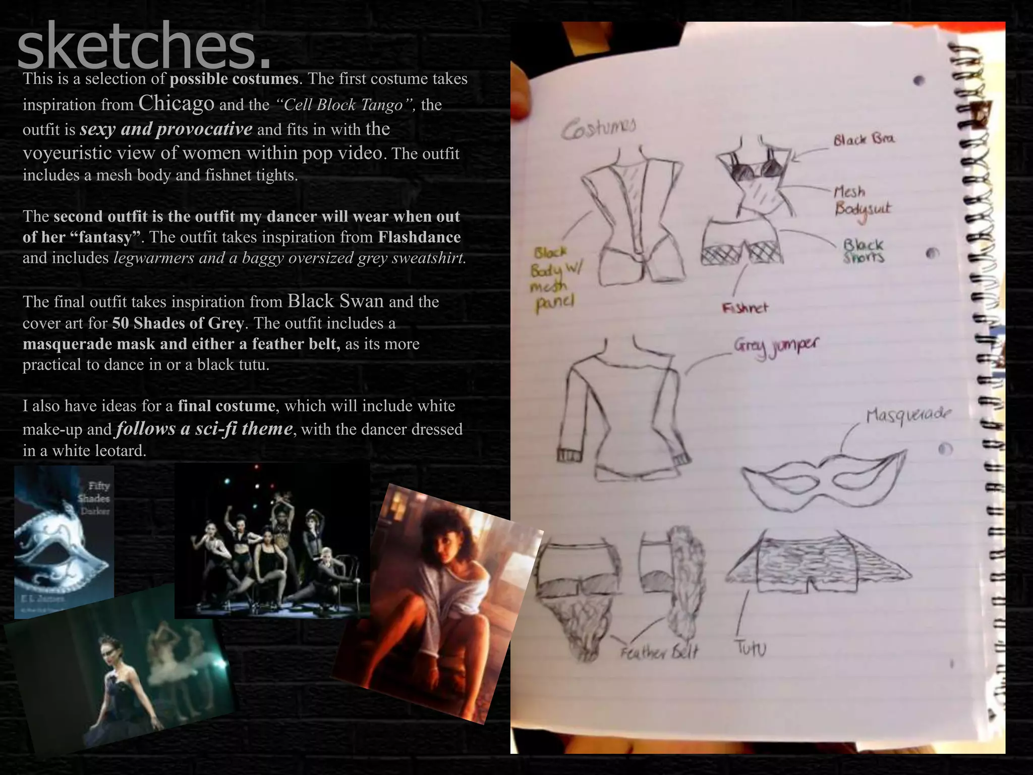 This document discusses potential costume ideas for a music video inspired by films like Chicago, Flashdance, and Black Swan. It describes 3 outfits for the dancer: 1) a sexy mesh and fishnet outfit, 2) a baggy sweatshirt and legwarmers, and 3) a masquerade mask and feather belt or tutu. It also mentions a white leotard sci-fi costume and a sequined dress with red lips and an updo for scenes with the artist. Props include a vintage microphone and balloons filled with flour to create smoke. Filming will take place in a location that can double as a performance space and dance studio with professional lighting.