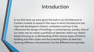 Samuel Gray created a sketchbook portfolio documenting different architectural styles from historic civilizations as part of an Architecture in Context module. He enjoyed researching Gothic architecture and included sketches of Neo-Gothic buildings in Nottingham. Gray also studied Roman architecture and included his most successful sketches of the Roman Coliseum and the Maison Carree in Nimes. While his early sketches of the Byron Building lacked detail, Gray improved over time by using different pens and pencils to add shading and texture. He believes the sketching skills developed will help him as an architecture student and later in his career.
