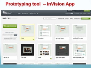 A prototype can simulate the final design through functionality and interactivity, and can take the form of paper sketches, linked wireframes, or a pre-alpha version. Prototypes can fall on a spectrum from "Lo-Fi" to "Hi-Fi" depending on how close they are to resembling the final product. Prototypes help communicate and test ideas early in the design process.