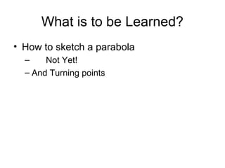 This document provides instructions on how to sketch parabolas by identifying their key features: