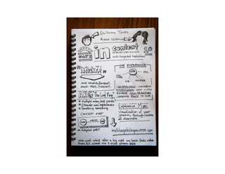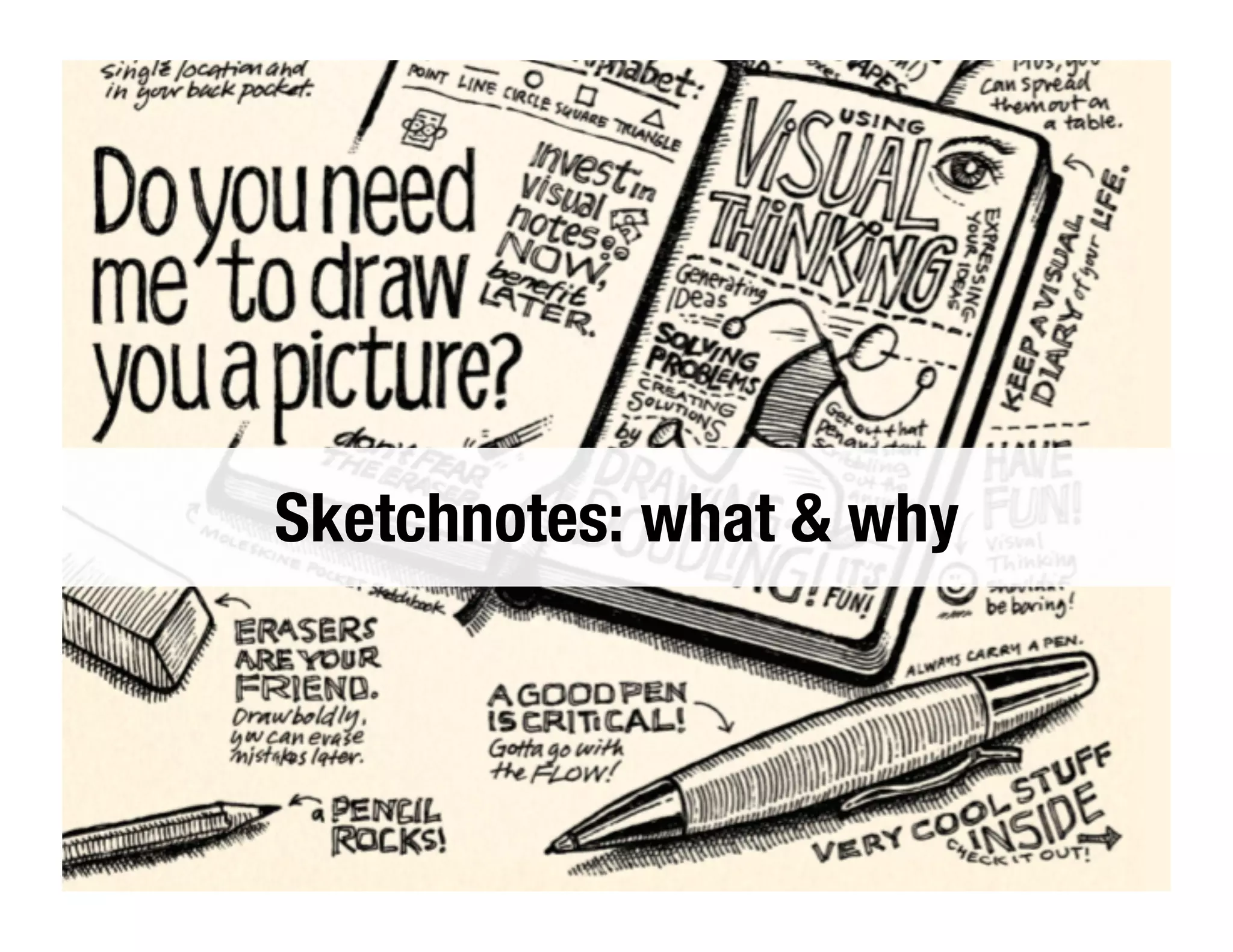 Sketchnotes are a visual way of taking notes that focuses less on words and more on capturing core ideas. Some benefits of sketchnotes include improved memory and recall, increased focus, and more meaningful notes. Examples of sketchnotes are provided, along with a plan for participants to create sketchnotes during an upcoming talk and share them to be posted online.