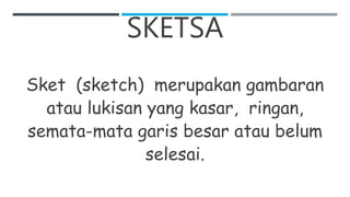Sketsa adalah gambaran kasar yang memberikan gambaran tema untuk meminimalisir kesalahan dan mempertajam pengamatan. Ilustrasi berfungsi memperjelas pesan dengan tiga fungsi yaitu deskriptif, ekspresif, dan analitis. Keduanya membantu memahami konsep secara cepat dengan menggunakan berbagai jenis gambar dan chart.