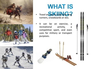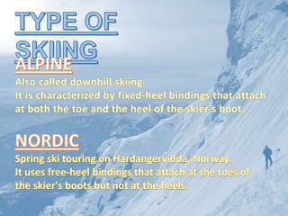 Freestyle skiing involves aerial tricks and skiing over moguls. It also includes ski cross, half-pipe, and slope style. Heli-skiing involves downhill skiing accessed via helicopter in remote, natural mountain areas. There are various competitive skiing disciplines categorized based on gate spacing and turns including slalom, giant slalom, super G, and downhill. Cross-country skiing uses the full body and is one of the most calorie-burning sports, involving skiing on unmaintained trails without lifts. Ski mountaineering combines skiing and mountaineering techniques.