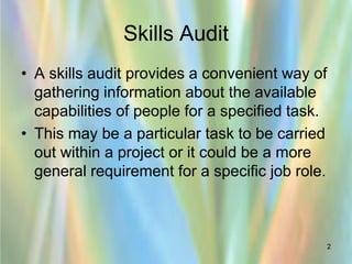 1) A skills audit involves gathering information about employees' capabilities for specific tasks or job roles. This allows organizations to understand strengths, weaknesses, and training needs.