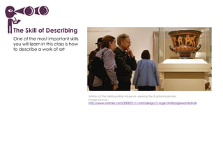 This document provides guidance on describing works of art. It discusses the four components of a visual description: identification, subject matter description, stylistic analysis, and contextual analysis. For subject matter description, it emphasizes using descriptive details to allow the reader to visualize the work. A good description should go beyond just listing details to reveal something deeper about the "personality" of the work. It provides an example description and analyzes how it effectively portrays the subject as majestic through selective details and persuasive language. The document also briefly introduces stylistic analysis but notes further discussion will come later after students learn more.