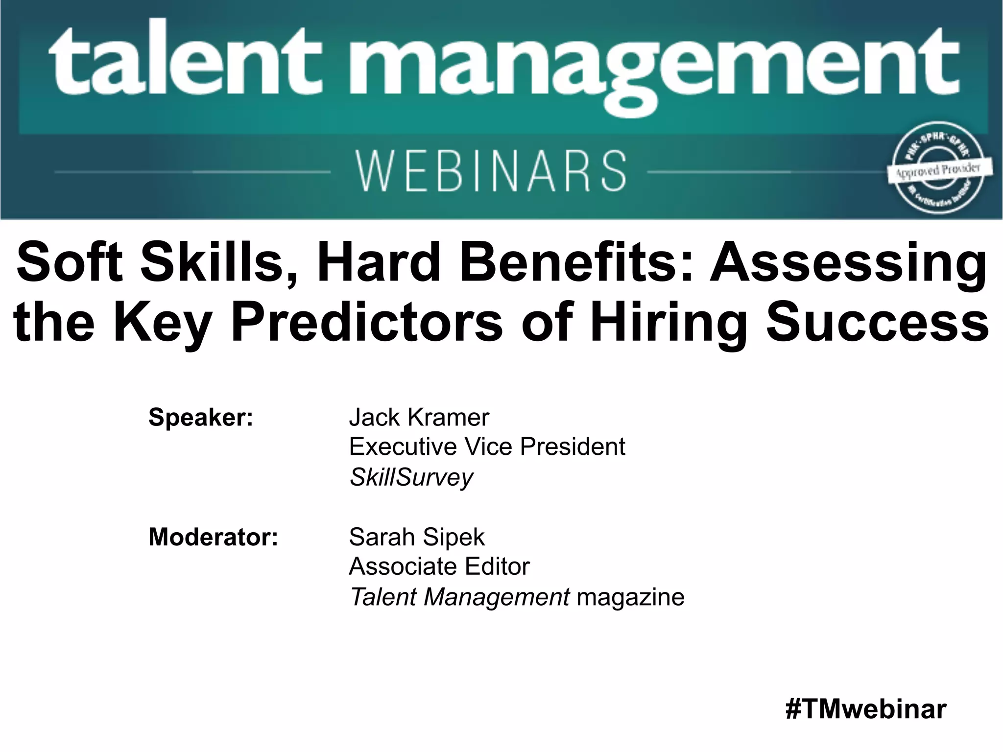 1. The webinar will discuss assessing key predictors of hiring success, specifically focusing on soft skills which are difficult to measure but important for predicting job performance.