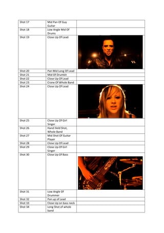 This document contains a list of 124 shots planned for a music video. It describes each shot number, the shot type (close-up, mid-shot, long shot, etc.), any camera movements (pan, tilt, track, etc.), and usually which band member or prop would be the subject of the shot. The variety of shots includes different angles, compositions, focal lengths, subjects, and camera movements to capture the performance from multiple perspectives.