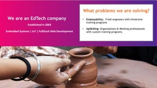 This document discusses an approach to skill entry level engineers in IoT. It outlines a multi-phase program that begins with building strong foundations in algorithms, data structures, and programming. Students are continuously assessed and receive feedback to improve. They are helped to identify their strengths and passions. Domain skills in IoT, embedded systems, and full stack development are then developed through hands-on projects. Constant mentoring and continuous improvement of the system helps ensure students are prepared for jobs in IoT. Key results include reduced hiring costs, high placement rates, and positive student outcomes.