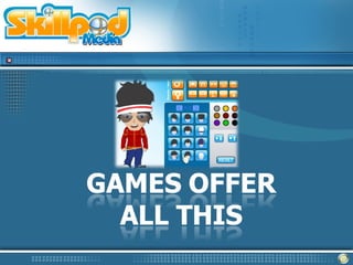 This document discusses how gaming can be used effectively to market to teenagers. It notes that teenagers spend much more time online than watching TV, and engage with various social media platforms. Some key points about teenagers are that they are continually connected, influenced by peers, seek recognition, and enjoy sharing content. The document provides tips for connecting with teenagers through gaming, such as not pretending, customizing content, and making everything shareable. It discusses different types of games and why casual games are popular. Examples are given of how gaming content has been used successfully in marketing, such as the Neopets virtual world. The document outlines opportunities for using games in advertising mediums, tournaments, and the benefits of gaming for community building, user acquisition