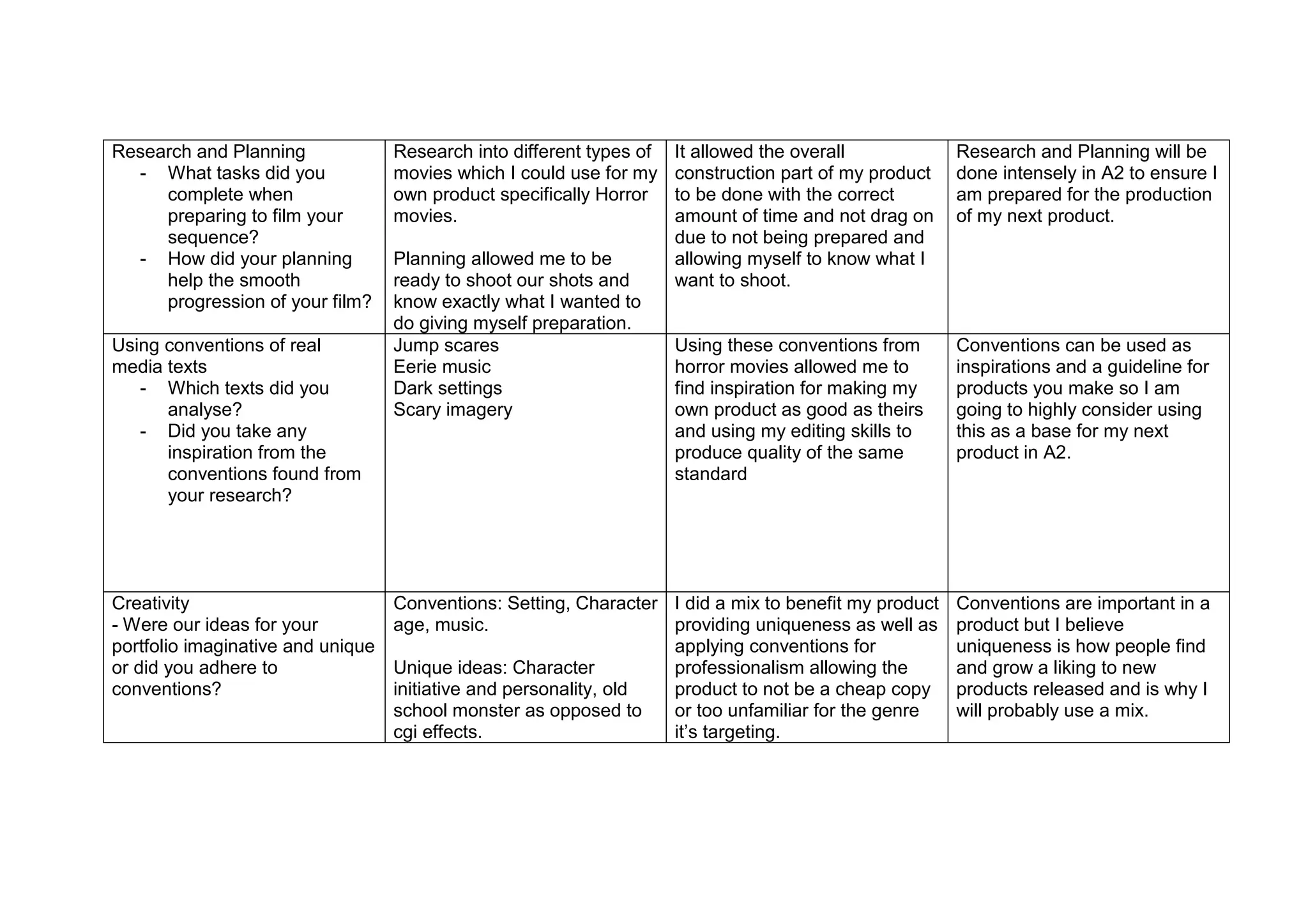 Daniel Hutchinson completed a personal skills audit to assess his abilities for an upcoming A2 project. He identified several digital skills like using a Mac computer with Photoshop and Microsoft Word that helped him create a blog for his previous work. He plans to continue developing these skills for the new project. Hutchinson also used video cameras, a tripod, and Final Cut software to film and edit a video. For research, he analyzed horror movies to inform conventions for his own work. Specifically, he took inspiration from elements like jump scares, eerie music, and dark settings. Going forward, he will focus on thorough research and planning to ensure preparedness. For the new project, Hutchinson aims to find a balance between adhering to genre