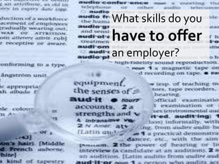 A skills audit or gap analysis allows librarians to analyze their current job skills and compare them to the skills required for new jobs. It involves identifying skills gained from past experience, determining how current job tasks translate to transferable skills, and analyzing job descriptions to understand needed skills. The skills audit can then be used to focus learning and professional development on growing existing skills to better match the requirements of target jobs, and to prepare tailored CVs and interviews.