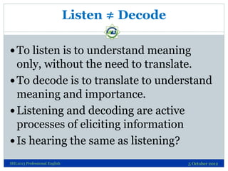 The document discusses the differences between hearing and listening. It states that hearing is a passive process of absorbing information, while listening is an active process of eliciting meaning through decoding. It also notes that listening skills are among the least used but most taught communication skills. The document provides tips on how to be an effective listener through strategies like paying attention, avoiding bias, understanding others' perspectives, and following the listening process of hearing, comprehending, analyzing, and remembering.