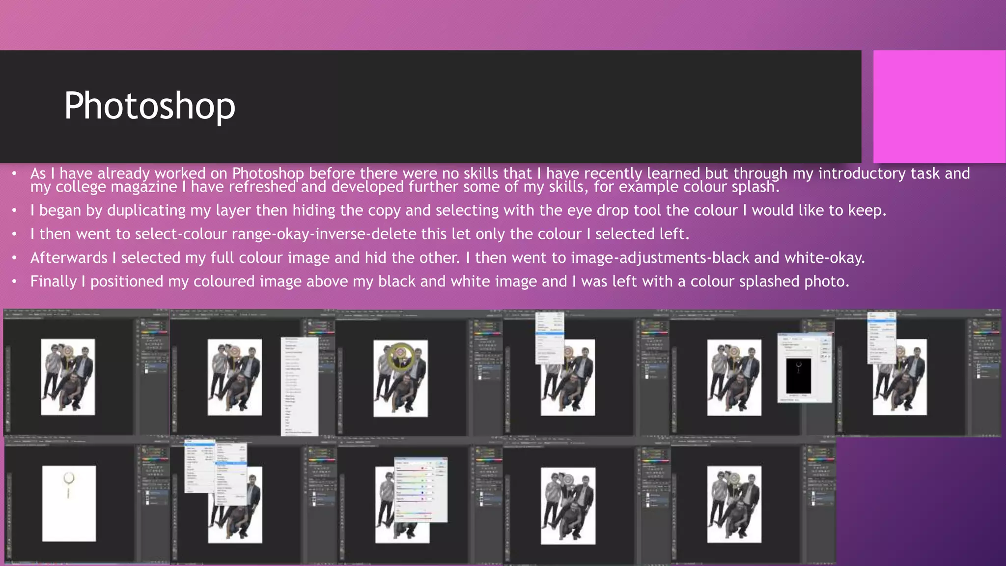 The document summarizes skills learned and developed in Photoshop and InDesign for a college magazine project. In Photoshop, the author refreshed skills like color splash and learned to change text on an image by selecting colors, adding textures, and adjusting layers. In InDesign, the author struggled at first due to differences from Photoshop but learned to insert and position images and add text boxes like in Photoshop.
