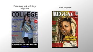 The document discusses skills developed while creating a college magazine and music magazine. It provides feedback on the use of shots, layout, fonts, audience targeting, and Photoshop tools for each magazine. For the music magazine, a mid-close up shot is used for the cover image for direct eye contact. Various fonts, colors, and textures are used that would appeal to the target reggae music audience. Selection and pen tools were used to accurately remove backgrounds of images.