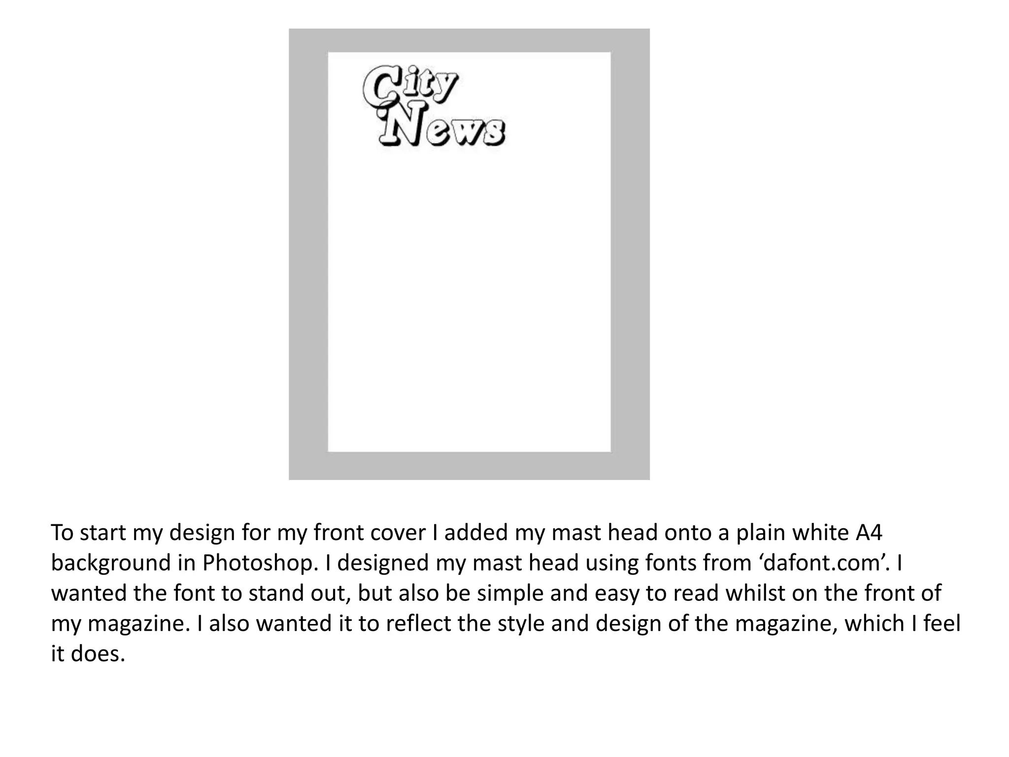 The document describes the process of designing a magazine cover and contents page in Photoshop. For the cover, the designer added a masthead, removed a male model from a photo using the eraser tool, added boxes with text to describe sections, filled a gap on the left with color, and added a barcode. For the contents page, the designer centered the masthead, added boxes with section names, and included logos and a photo with the background removed.