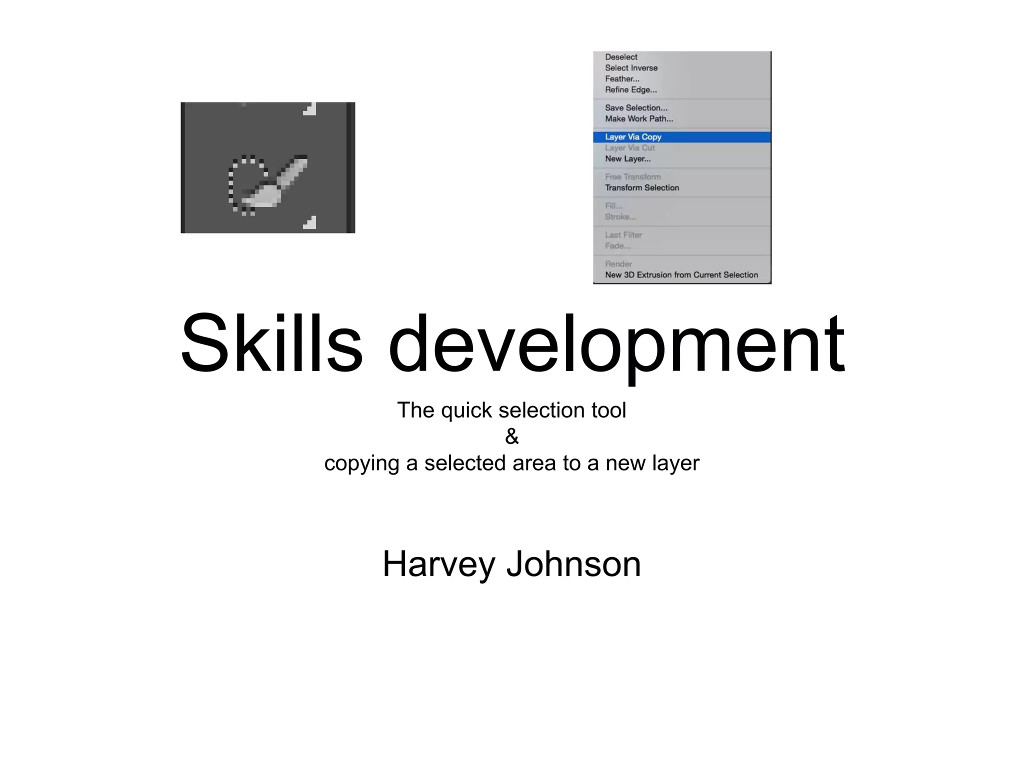 Harvey Johnson used the quick selection tool to select a specific part of an image for editing. He dragged the cursor over the areas he wanted to select, then copied the selection to a new layer. This allowed him to apply effects to the background without affecting the model in the image.