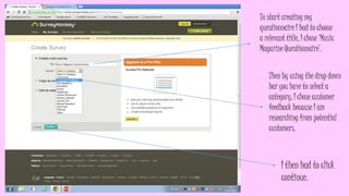 The document describes the steps to create a questionnaire using Survey Monkey: 1) Choose a title and category for the questionnaire, 2) Click "add question" to type a question and select a question type like multiple choice from a dropdown, 3) Type answer options and click save, 4) Repeat to add more questions, 5) View the final questionnaire product.