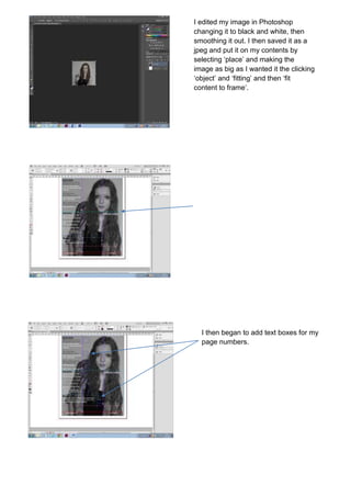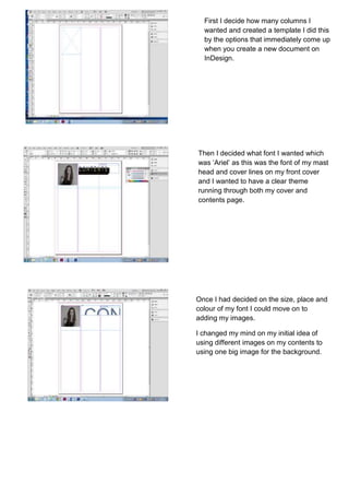 The document describes the process of creating a contents page in InDesign. First, the author decided on the number of columns and created a template. Then, they chose the font "Ariel" to match the cover. Images were added by editing one in Photoshop, saving it as a JPEG, and placing it in InDesign. Cover lines and page numbers were added using text boxes and guidelines. The author checked that text boxes would not appear on the final design.