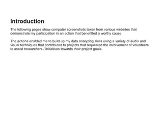 Mike Bright provides screenshots from various websites demonstrating his data analysis skills by participating in volunteer projects. The screenshots show: