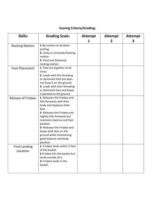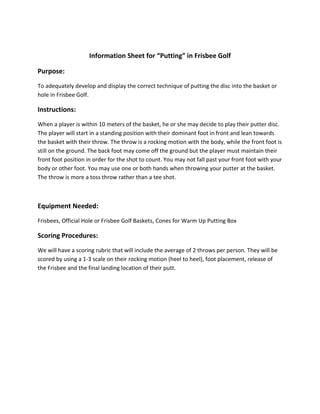 This document provides instructions for assessing the putting technique in frisbee golf. It outlines the proper form for a putt, including maintaining front foot placement and using a rocking body motion. Students will be evaluated on their form based on a 1-3 scoring rubric measuring their rocking motion, foot placement, disc release, and whether the disc lands in the basket. Accommodations are provided for students with disabilities, modifying the criteria based on individual abilities.