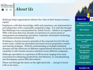 Skillscape is a human resources consulting firm that specializes in enhancing organizational and employee competencies through various HR services and interventions. The firm was founded by Ashok Grover, an engineer-MBA with over 40 years of experience in HR development. Skillscape offers a spectrum of HR solutions including needs assessments, training programs, 360-degree feedback, and engagement surveys to help organizations improve performance, reduce conflict, and enhance their human capital.