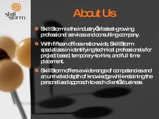 SkillStorm is a professional services and consulting company specializing in technical staffing with 15 offices nationwide. They identify professionals for project-based, temporary, and full-time roles, offering a wide range of IT and engineering competencies. SkillStorm has over 1,200 employees, a database of 300,000 technical resumes, and works with many Fortune 500 companies and federal agencies.