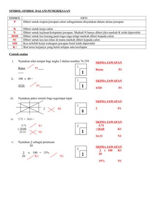 Dokumen ini memberikan panduan tentang sistem pemarkahan bagi kertas jawapan calon dengan menggunakan simbol-simbol tertentu. Ia merangkumi pelbagai contoh soalan dan cara pemarkahan yang berbeza untuk mendapatkan markah berdasarkan ketepatan jawapan. Terdapat juga penerangan mengenai proses pemarkahan untuk kes-kes khas dan situasi tertentu dalam penilaian.