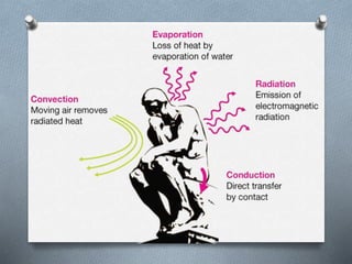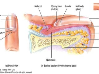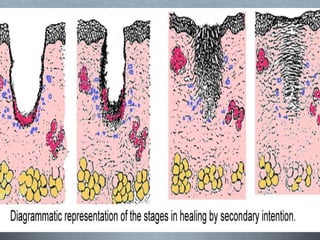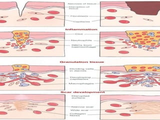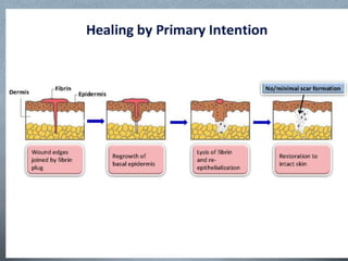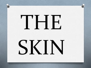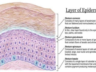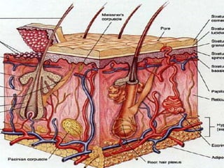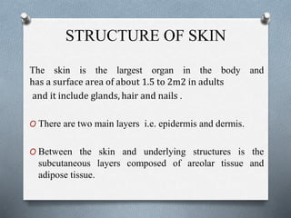 The document provides a comprehensive overview of the skin's structure, including its layers (epidermis and dermis), functions (protection, temperature regulation, sensation), and various components like hair, nails, and glands. It details the processes involved in wound healing, including inflammation, proliferation, and maturation, as well as complications such as infections. Additionally, the document explains the roles of melanin and other factors in skin color and the mechanisms of regulating body temperature.