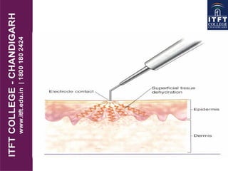 This document summarizes different skin treatment procedures including electrofulguration, electrodesiccation, electrocoagulation, and electrosection which use heat generation to damage tissue at varying depths depending on power settings. It also discusses chemical peels, specifically alpha hydroxy acid peels, which use chemical solutions to exfoliate and rejuvenate the skin by causing dead skin cells to slough off and peel. Alpha hydroxy acid peels provide gentle exfoliation and skin rejuvenation results like reducing uneven pigmentation and improving the look of fine lines.