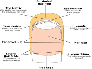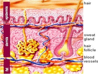 The skin has three main layers - the epidermis, dermis, and hypodermis. The epidermis is made of stratified squamous epithelium. It has several sublayers including the basal, spinous, granular, and stratum corneum layers. The dermis lies beneath the epidermis and contains collagen, elastin, and ground substance. It has two layers - a papillary and reticular layer. Blood vessels, nerves, hair follicles and sweat glands are found in the dermis. The hypodermis or subcutaneous layer lies beneath the dermis and contains fat.