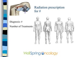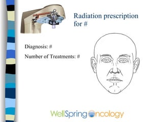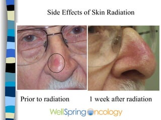 The document discusses different types of skin cancer including basal cell carcinoma, squamous cell carcinoma, and melanoma. It provides details on symptoms, treatment options like surgery, radiation therapy, and Mohs microsurgery. Radiation therapy is described as an effective non-surgical treatment option that results in mild sunburn-like side effects and healing of the skin within a few weeks. Images are included showing examples of different skin cancers and results after radiation treatment.