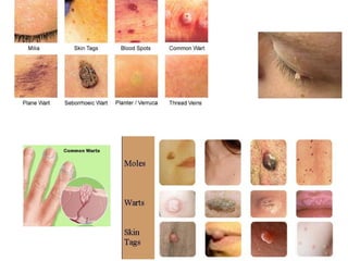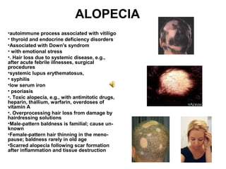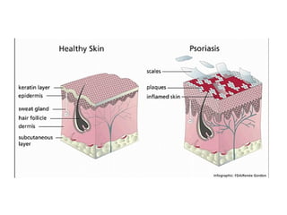Skin diseases discussed in the document include alopecia, acne, amyloid disease, cellulitis, eczema, psoriasis, scabies, pityriasis alba, urticaria, basal cell carcinoma, seborrheic dermatitis and more. For each condition, causes, locations, symptoms and treatments are described in detail providing an overview of common dermatological conditions.