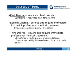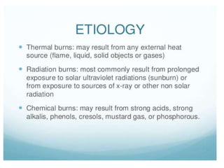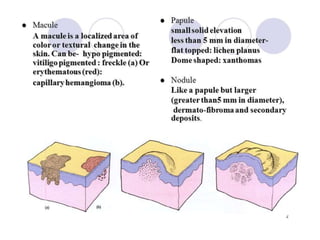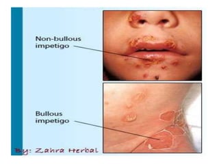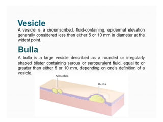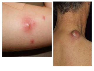 This document discusses several common skin conditions and infections, including their causes, symptoms, and treatment. It covers folliculitis, furuncles, cellulitis, pediculosis, scabies, dermatitis, acne, impetigo, warts, dermatophytosis, and types of burns. The causes typically involve bacterial or fungal infections. Symptoms vary depending on the condition but often include inflammation, redness, itching, pustules, and pain. Treatments involve antibiotics, antifungals, anti-parasitic medications, and procedures like cryotherapy. Good hygiene and avoiding irritants are also recommended.